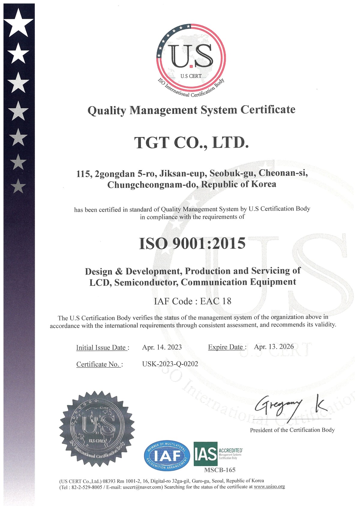 [Certi] USF-16-2-2 인증서_영문(rev.4)_티지티_Q_최초_2023.jpg 페이지 정보 작성자 티지티 작성일 25-09-02 11:14 조회 131회 댓글 0건 본문 이전글티지티 연구개발전담부서 인정서 목록